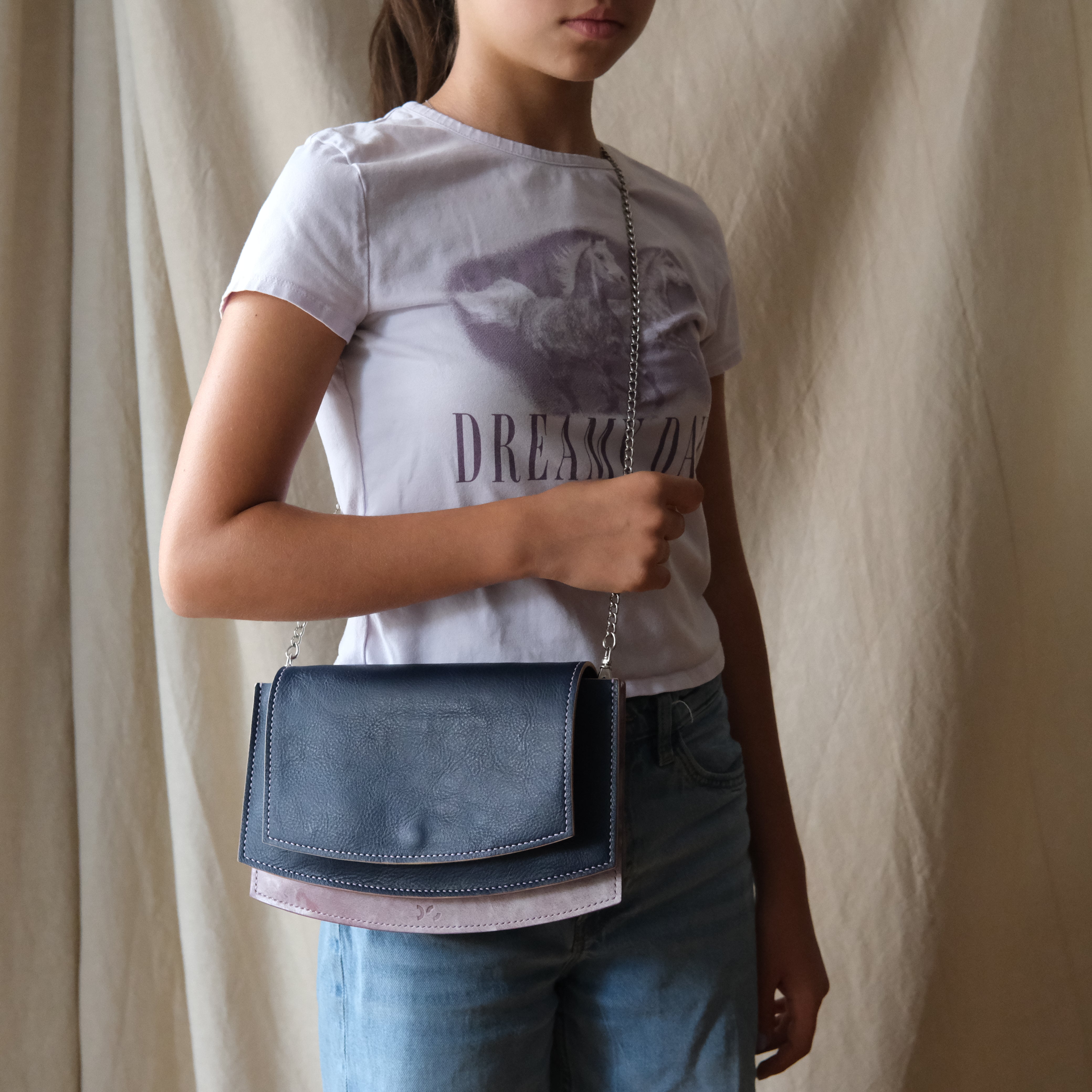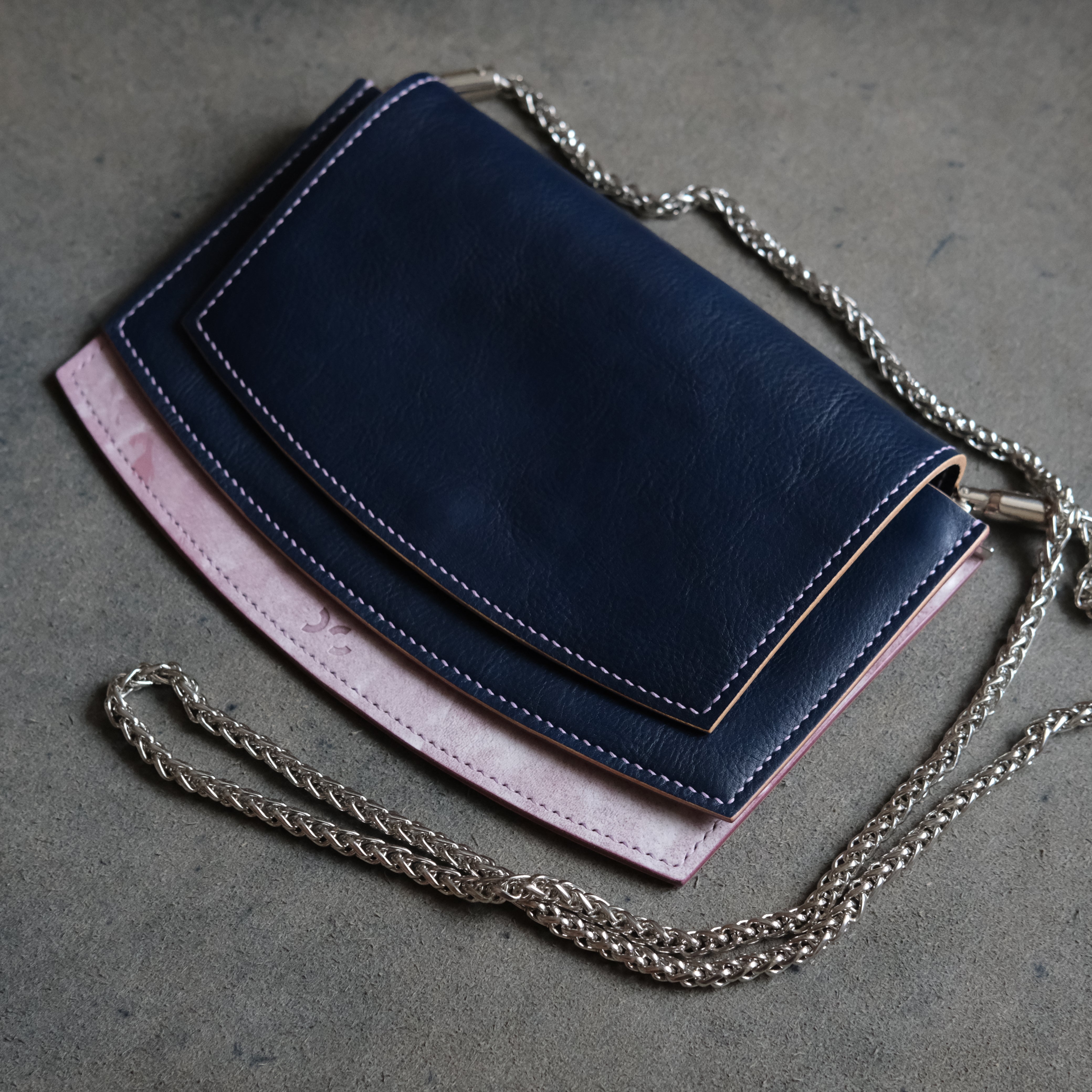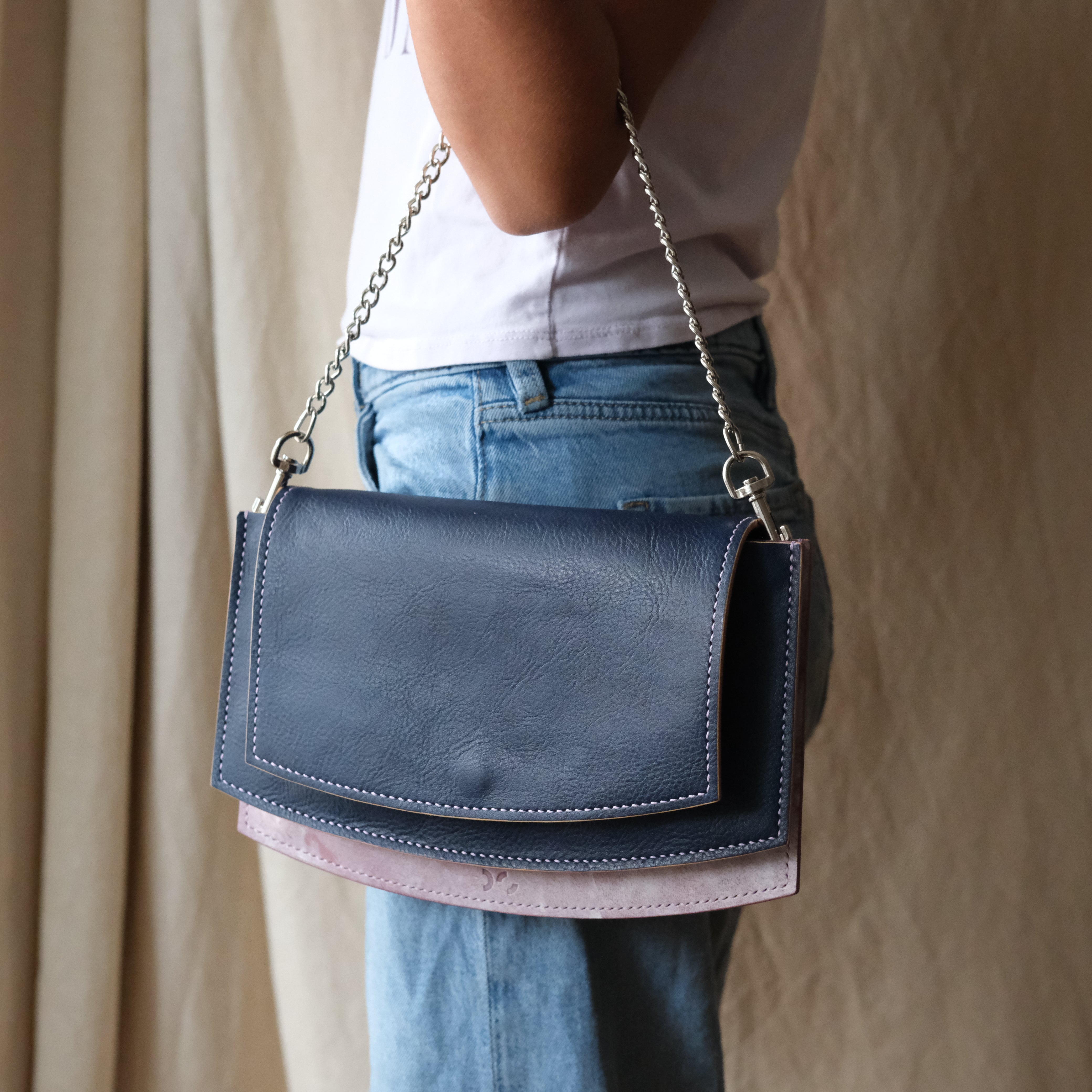 > Strap Option A – a purse chain: 80 to 120cm. The Bag can be carried without any strap as a clutch, on-shoulder with shorter purse chain and as cross-body with longer chain hence the range given. Those are available in many variations online when searching for a “purse chain”. They usually come with swivel clasp buckles already attached to them. The Breakwater Bag is specifically designed to be carried with a purse chain, however I have included also a leather strap option in the pattern files.