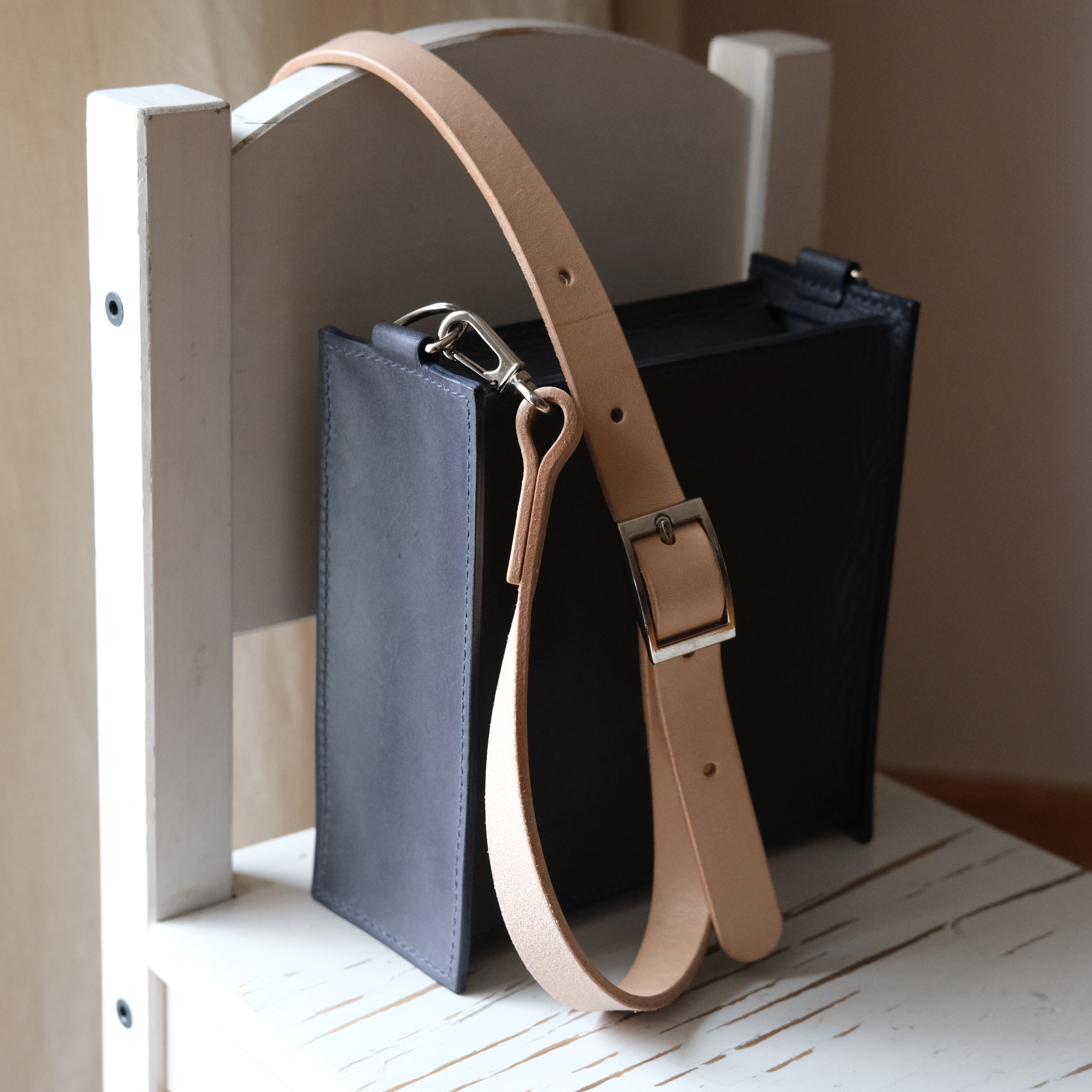 > 2.0-2.2mm thickness (5-5.5oz) for the strap. The strap is 20mm (4/5 of an inch) wide and you need two pieces – one 48cm (~19in) long and one 90cm (~35in) long.